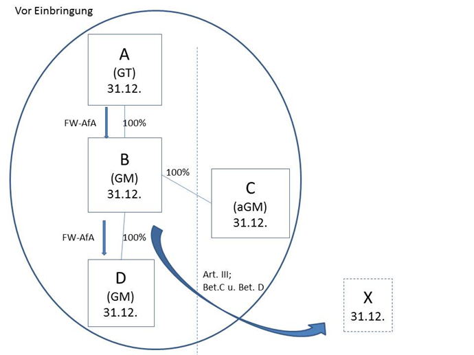 Mit Ablauf des Einbringungsstichtages 31.12.02 enden die Zugehörigkeit der eingebrachten Beteiligungen (aGM C und GM D) zur B, mit dem auf den Einbringungsstichtag folgenden Tag tritt die als Gegenleistung gewährte Beteiligung an der X an deren Stelle.