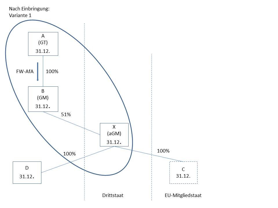 Bringt ein in- oder ausländisches Gruppenmitglied einen Betrieb oder Teilbetrieb in eine gruppenfremde Körperschaft ein, ändert dies nichts an seiner Gruppenzugehörigkeit (denkbar wäre allerdings ein wirtschaftliches Ausscheiden des ausländischen Gruppenmitglieds).Die Firmenwertabschreibung auf die Beteiligung an der einbringenden inländischen Körperschaft vermindert sich oder entfällt.