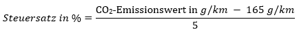 Wird bei einem Kraftfahrzeug der CO2-Ausstoß von 253 g/km überschritten, erhöht sich die Steuer für den die Grenze von 253 g/km übersteigenden CO2-Ausstoß um 50 Euro je g/km.Beispiel: