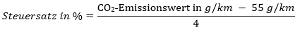 Der Steuersatz errechnet sich: (160 g/km - 55 g/km) / 4 = 26,25 --> Höchststeuersatz 20%.