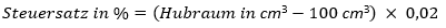 Der Steuersatz errechnet sich: (1.000 cm3 - 100 cm3) x 0,02 = 18%
