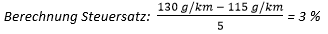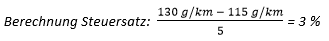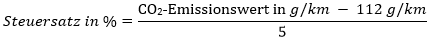 Für andere Kraftfahrzeuge (zum Beispiel Pkw, Kombi, Vans) errechnet sich der Steuersatz in Prozent nach der folgenden Formel:Die errechneten Prozentsätze sind kaufmännisch auf volle Prozentsätze zu runden (daher bis 0,49 abrunden, ab 0,50 aufrunden).