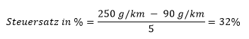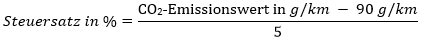 Übersteigt bei einem Kraftfahrzeug der CO2-Ausstoß 250 g/km, so erhöht sich die Steuer für den die Grenze von 250 g/km übersteigenden CO2-Ausstoß um 20 Euro je Gramm CO2 pro Kilometer.Beispiel: