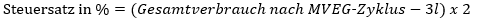 Liegt kein Gesamtverbrauch nach dem MVEG-Zyklus vor, so ist für die Berechnung des Steuersatzes der Durchschnittsverbrauch mit dem 0,2-fachen der Leistung in Kilowatt anzunehmen.
