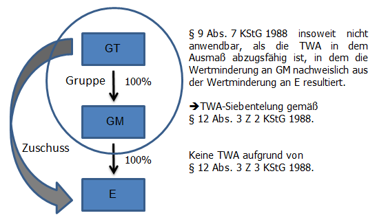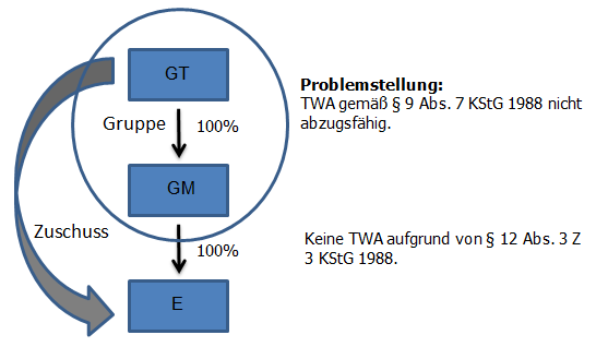 GT hält 100% der Anteile an GM. GT und GM bilden eine steuerliche Unternehmensgruppe gemäß § 9 KStG 1988. GM hält 100% der Anteile an der nicht gruppenzugehörigen E. GT gewährte E in 2010 einen Zuschuss in Höhe von 700.000 Euro; der Beteiligungsansatz von GM und E wird um jeweils 700.000 Euro erhöht. Da der Zuschuss nicht werthaltig ist, wurde die Beteiligung an E durch GM in 2011 unternehmensrechtlich um 700.000 Euro abgeschrieben. Aufgrund von § 12 Abs. 3 Z 3 KStG 1988 konnte diese Abschreibung für steuerliche Zwecke nicht vorgenommen werden.
