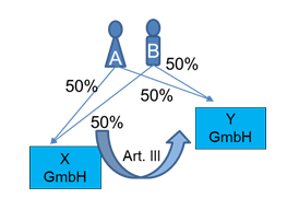 Die natürlichen Personen A und B sind zu je 50% an der inländischen X-GmbH und an der inländischen Y-GmbH beteiligt. Zum 31.12.X1 bringen A und B ihre Anteile an der X-GmbH gemäß Art. III UmgrStG in die Y-GmbH ein.
