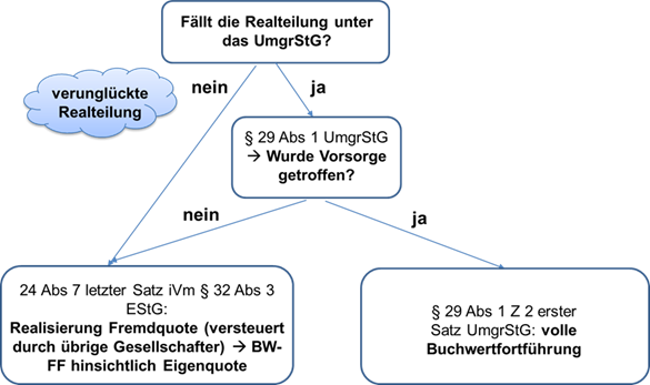 - eine Realteilung im Sinne des UmgrStG ohne Vorsorge gemäß § 29 Abs. 1 Z 2 iVm 24 Abs. 2 UmgrStG durch Ausgleichsposten (siehe Rz 1643) sowie