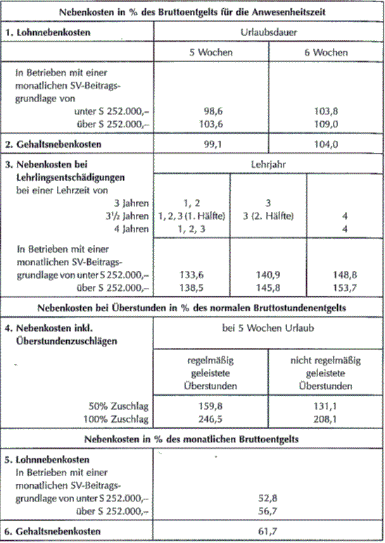 Nach dem KV für Arbeiter im eisen- und metallverarbeitenden Gewerbe Österreichs bzw. für Angestellte des Gewerbes sowie nach auf statistischen Durchschnittswerten basierenden Berechnungen - insbesondere bei den Nichtanwesenheitszeiten und den sonstigen Kosten - ergeben sich zum Stand 1. 1. 1998 für Lohn- und Gehaltsnebenkosten folgende Sätze: