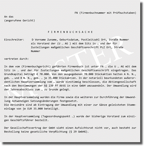 Nach den Bestimmungen der §§ 239 ff AktG kann eine AG in eine GmbH umgewandelt werden. Das Muster soll das Wichtigste bei diesem Vorgang kurz darstellen.