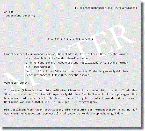 Anmeldung der Herabsetzung der Haftsumme bei einer Kommanditgesellschaft, bei der kein unbeschränkt haftender Gesellschafter eine natürliche Person ist