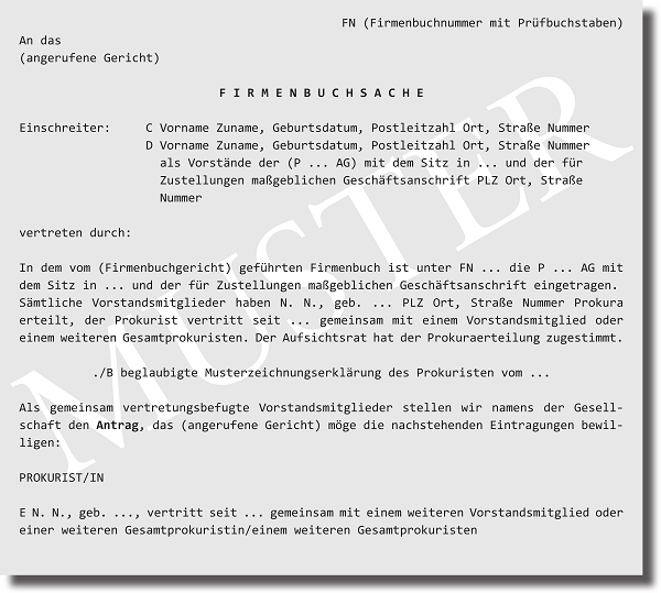 Die Bestellung einer Prokuristin/eines Prokuristen soll bei der AG nur mit Zustimmung des Aufsichtsrates erfolgen (§ 95 Abs 5 Z 11 AktG).