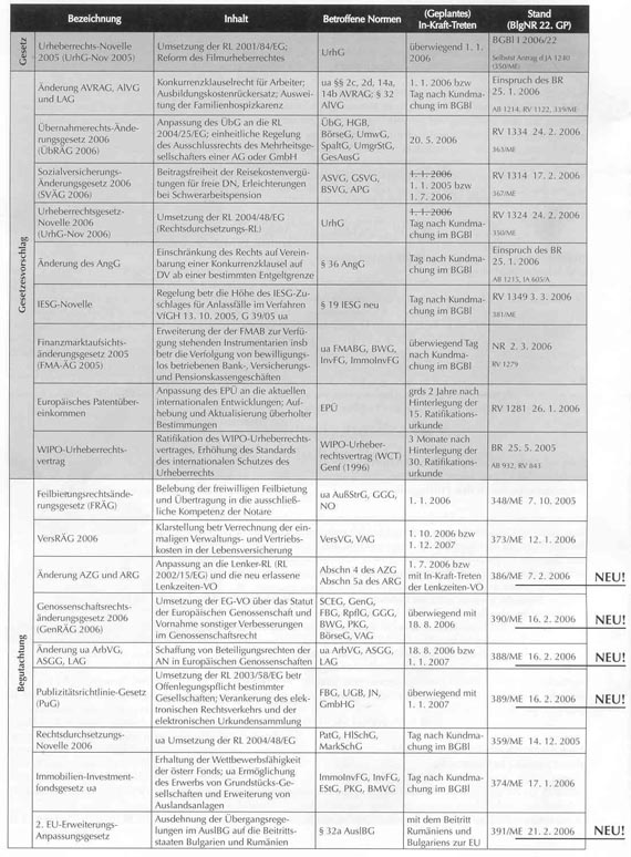 Übersicht über den Stand wichtiger aktueller Gesetzesvorhaben (Stand: 6. 3. 2006)